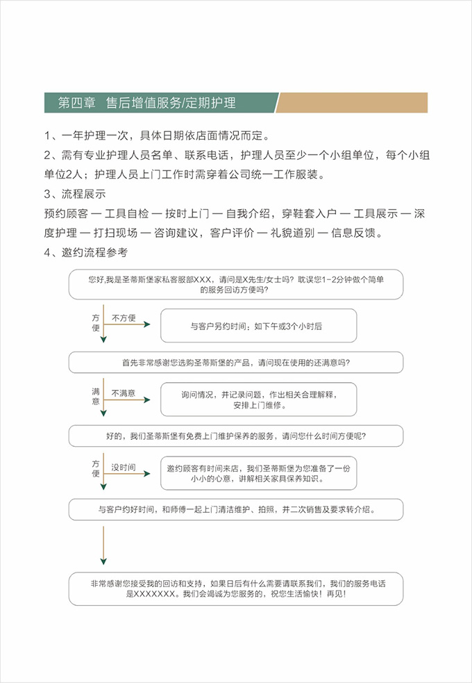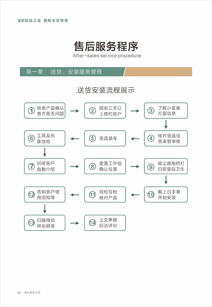 話術(shù)參考:“**先生/女士您好,我是圣蒂斯堡的售后服務(wù)人員**,您購買的圣蒂斯堡家具已經(jīng)全部到貨了,送貨安裝大約需要**時間,請問您這邊什么時候方便我們上門送貨安裝呢?”同時要了解送貨小區(qū)的電梯、樓道、入戶門的尺寸等,提前做好準(zhǔn)備,避免意外情況。最后確定送貨時間(安裝所需要時長),并告知客戶安裝人員的相關(guān)信息,可加微信發(fā)送,并發(fā)送配送安裝流程說明。