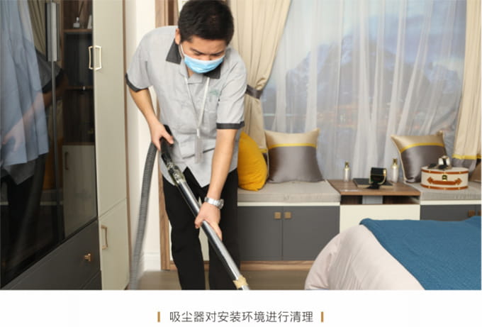產(chǎn)品安裝確認(rèn)無誤后及時清理房間內(nèi)因安裝產(chǎn)生的垃圾并保持空氣流暢,然后用干凈的抹布將家具擦拭一遍,確保產(chǎn)品清潔,用吸塵器對安裝環(huán)境進(jìn)行清理,并對所有安裝好的產(chǎn)品拍攝記錄作為完工效果備案。