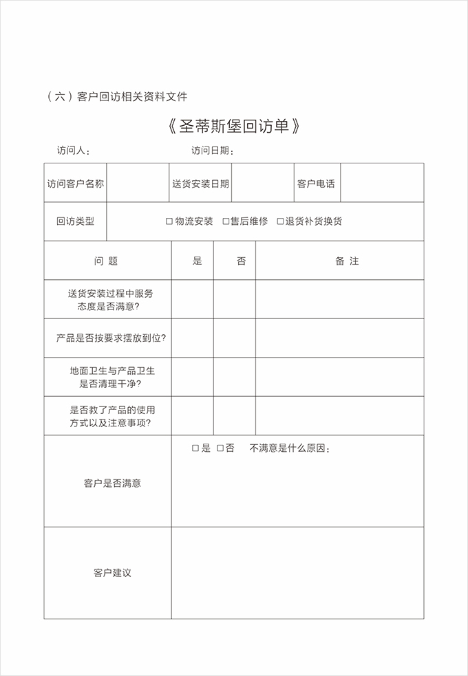 售后人員完成售后,將有客戶簽名的《產(chǎn)品配送單》《配送滿意度調(diào)查表》交給店面經(jīng)理。店面經(jīng)理根據(jù)處理完成結(jié)果登記存檔,并對客戶進(jìn)行回訪,確定送貨安裝服務(wù)完成,并了解客戶對公司整個服務(wù)過程的滿意情況。