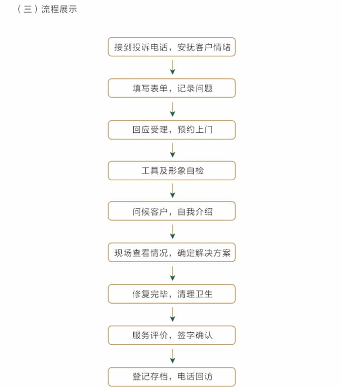 必須按照客戶約定,至少提前5分鐘上門,見到客戶時需自我介紹,并出示上崗證和名片,在進(jìn)入顧客家前應(yīng)穿上自備的鞋套。征得客戶同意后開始維修,嚴(yán)禁亂收費(fèi)。