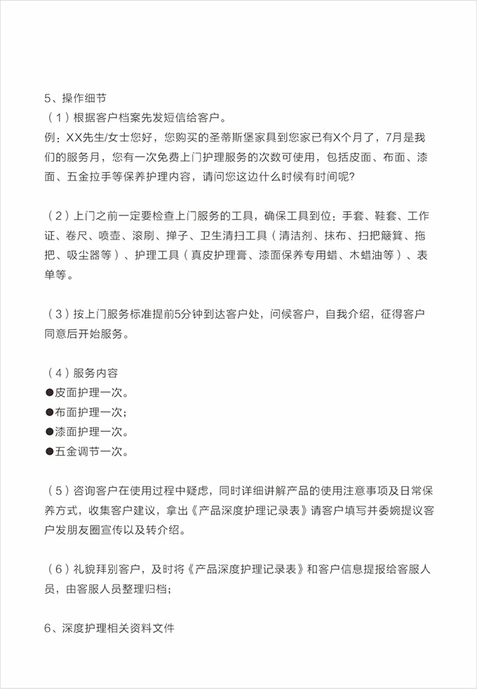 產(chǎn)品處理完畢后必須一站式通檢,指導(dǎo)客戶使用,并將服務(wù)過程中產(chǎn)生的垃圾隨手帶走,家具維修完畢后,應(yīng)用毛巾將家具擦拭一遍,確保產(chǎn)品清潔。